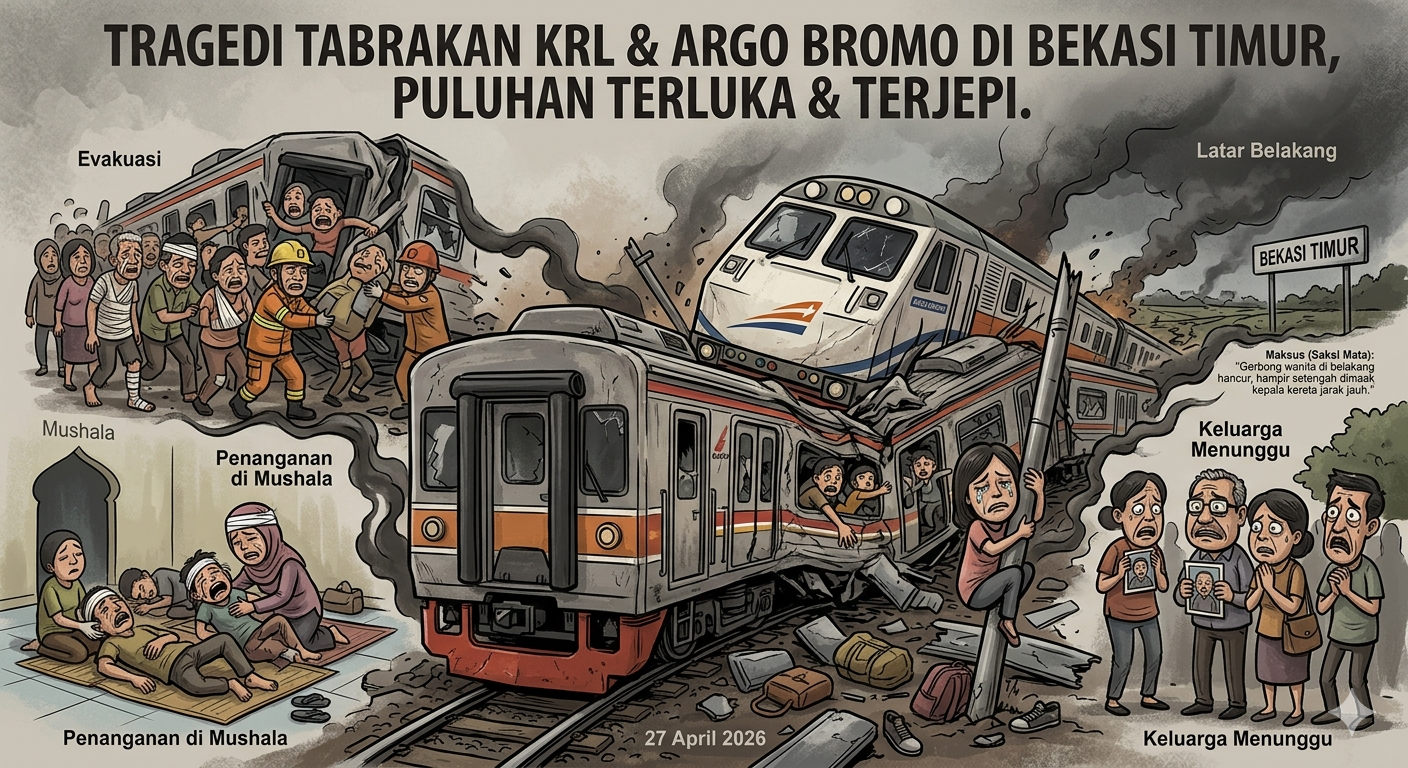 Insiden kecelakaan kereta api terjadi di Stasiun Bekasi Timur pada Senin malam (27/4/2026) sekitar pukul 20.57 WIB. Sebuah kereta commuter line (KRL) dilaporkan tertabrak dari belakang oleh kereta jarak jauh Argo Bromo Anggrek, mengakibatkan kerusakan parah pada bagian belakang rangkaian serta menimbulkan korban luka.